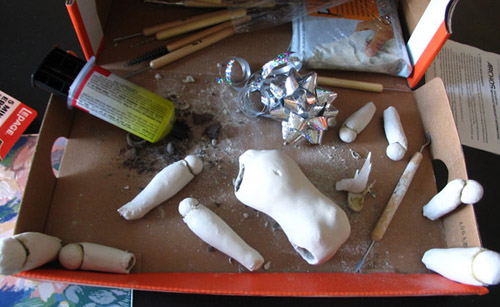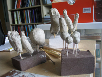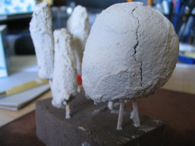 J'ai mis une première couche d'argyle et de brin de scie sur les formes. C'est vraiment laid comme ça, mais rien ne colle sur la mousse. À la deuxième couche je vais pouvoir commencer à mettre plus de détails...